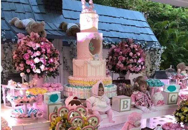 A decoração, cheia de ursinhos, bonecas e flores girava em torno da cor rosa.