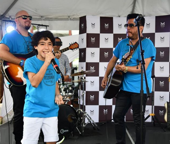 O palco, montado dentro do condomínio, recebeu os cantores e também o pequeno Enzo, que cantou acompanhado pelo pai, Bruno.